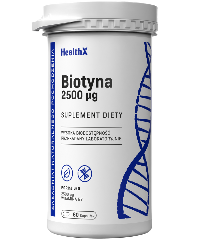 HealthX Biotyna w kapsułkach to D-biotyna (witamina B7/H) w wygodnych kapsułkach HPMC. Każda kapsułka zawiera precyzyjnie odmierzone 2500 µg D-biotyny — optymalną dawkę wspierającą włosy, skórę i paznokcie.
