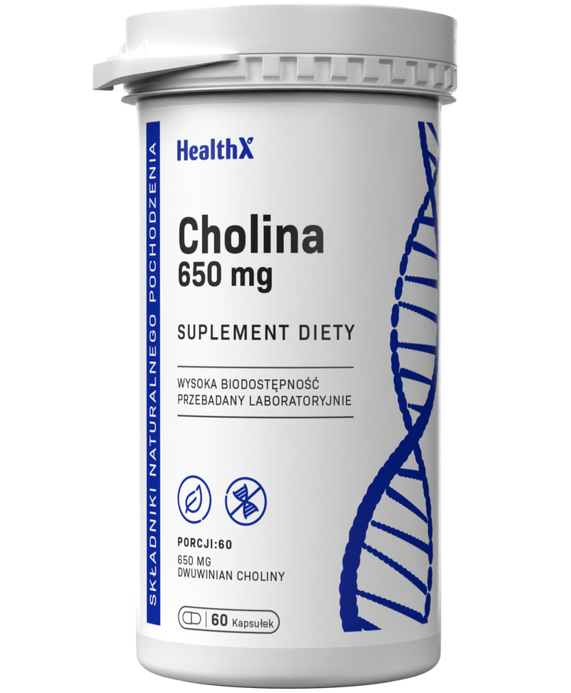 HealthX Cholina w kapsułkach to bitartrat choliny w wygodnych kapsułkach HPMC — niezbędny składnik odżywczy wspierający wątrobę, mózg i metabolizm tłuszczów. Precyzyjna dawka 250 mg choliny na kapsułkę — jedna kapsułka dziennie to komfort suplementacji.