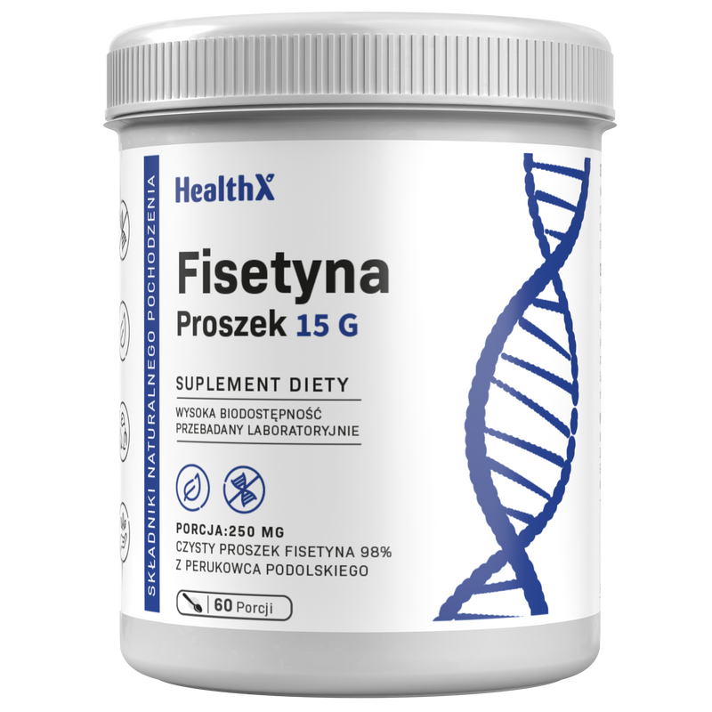 HealthX Fisetyna 98% w formie proszku to wysoko oczyszczony flawonoid senolityczny — naturalny polifenol z truskawek o potwierdzonej aktywności anty-aging. Proszek o czystości 98% zapewnia elastyczne dawkowanie i maksymalną moc w każdej porcji.