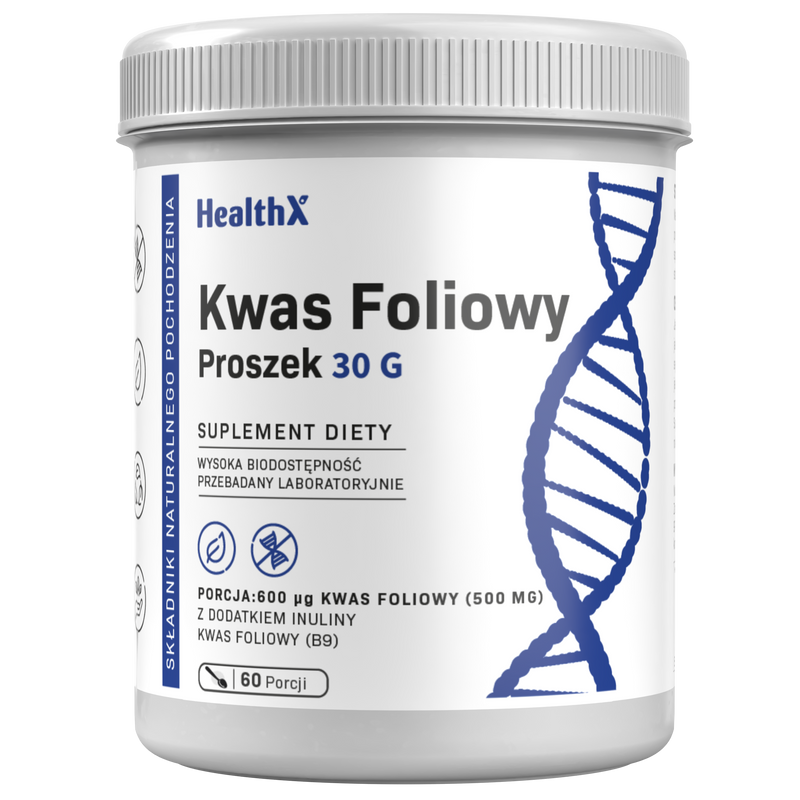 HealthX Kwas Foliowy w proszku to czysty kwas pteroiloglutaminowy (witamina B9) — kluczowy kofaktor syntezy DNA i prawidłowego podziału komórek. Proszek umożliwia precyzyjne dawkowanie za pomocą dołączonej miareczki — 400 µg folianów na porcję.