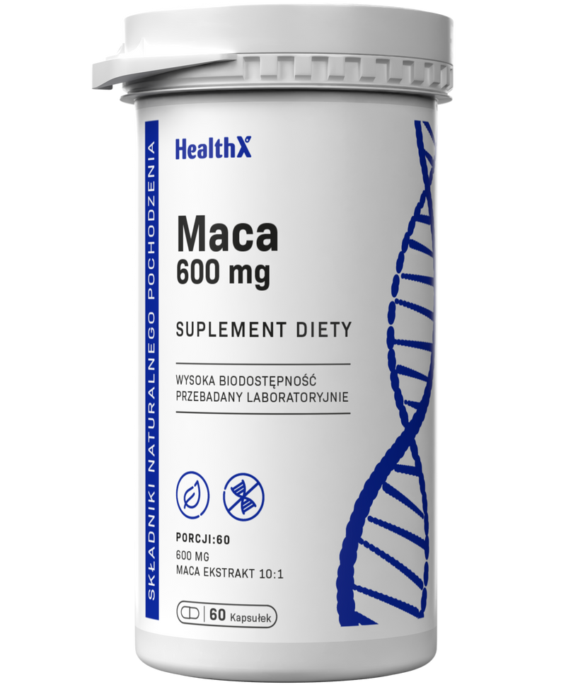 HealthX Maca 10:1 Ekstrakt w kapsułkach to skoncentrowany ekstrakt z korzenia macy peruwiańskiej (Lepidium meyenii) — adaptogenu tradycyjnie stosowanego w Andach dla poprawy energii, wytrzymałości i równowagi hormonalnej. Każda kapsułka HPMC zawiera 600 mg ekstraktu 10:1, co odpowiada 6000 mg surowego korzenia macy.