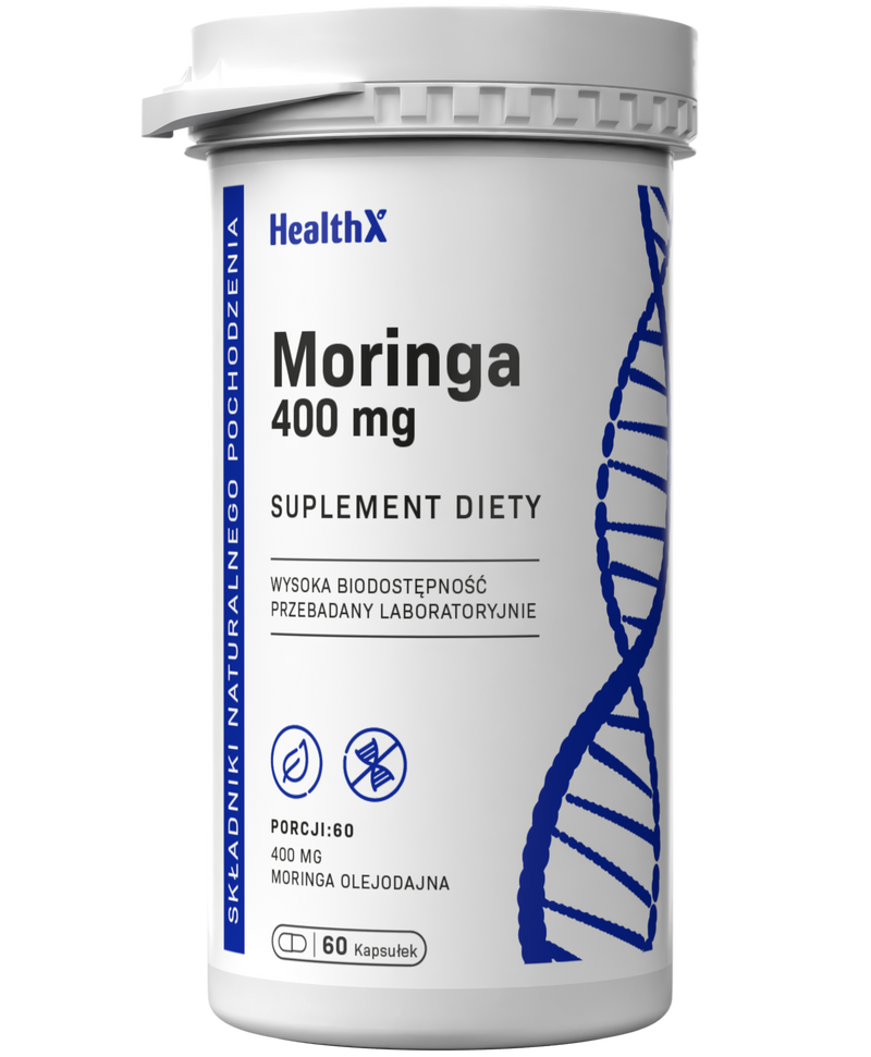 HealthX Moringa w kapsułkach to Moringa oleifera — superroślina nazywana „drzewem życia”, zawierająca ponad 90 składników odżywczych. Każda kapsułka HPMC dostarcza 400 mg moringi, wspierając układ odpornościowy, poziom energii i zdrowie metaboliczne.