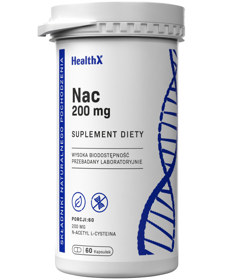 HealthX NAC (N-Acetylocysteina) w kapsułkach to N-acetylocysteina — prekursor glutationu, najważniejszego endogennego antyoksydantu w organizmie. Każda kapsułka HPMC dostarcza 200 mg NAC, który wspiera detoksykację wątroby, drogi oddechowe i ochronę komórek przed stresem oksydacyjnym.