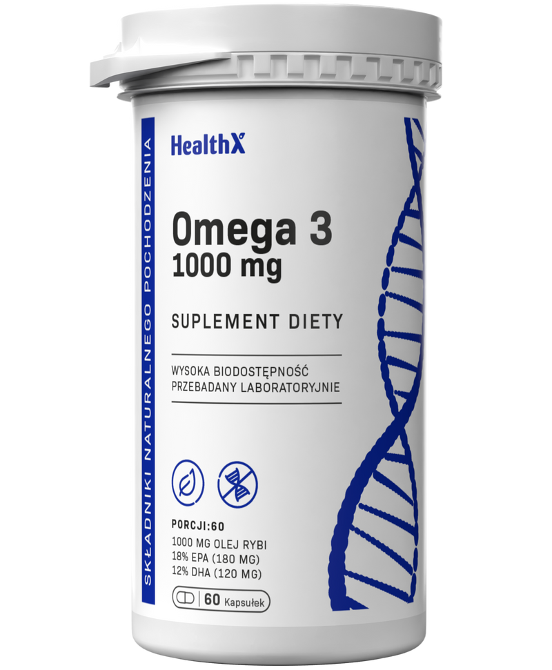 HealthX Omega-3 w kapsułkach to olej rybi o standaryzowanej zawartości EPA 180 mg i DHA 120 mg na kapsułkę — niezbędne nienasycone kwasy tłuszczowe wspierające serce, mózg i wzrok. Dawka 1000 mg oleju rybiego w kapsułce żelatynowej gwarantuje optymalną proporcję EPA:DHA (3:2).