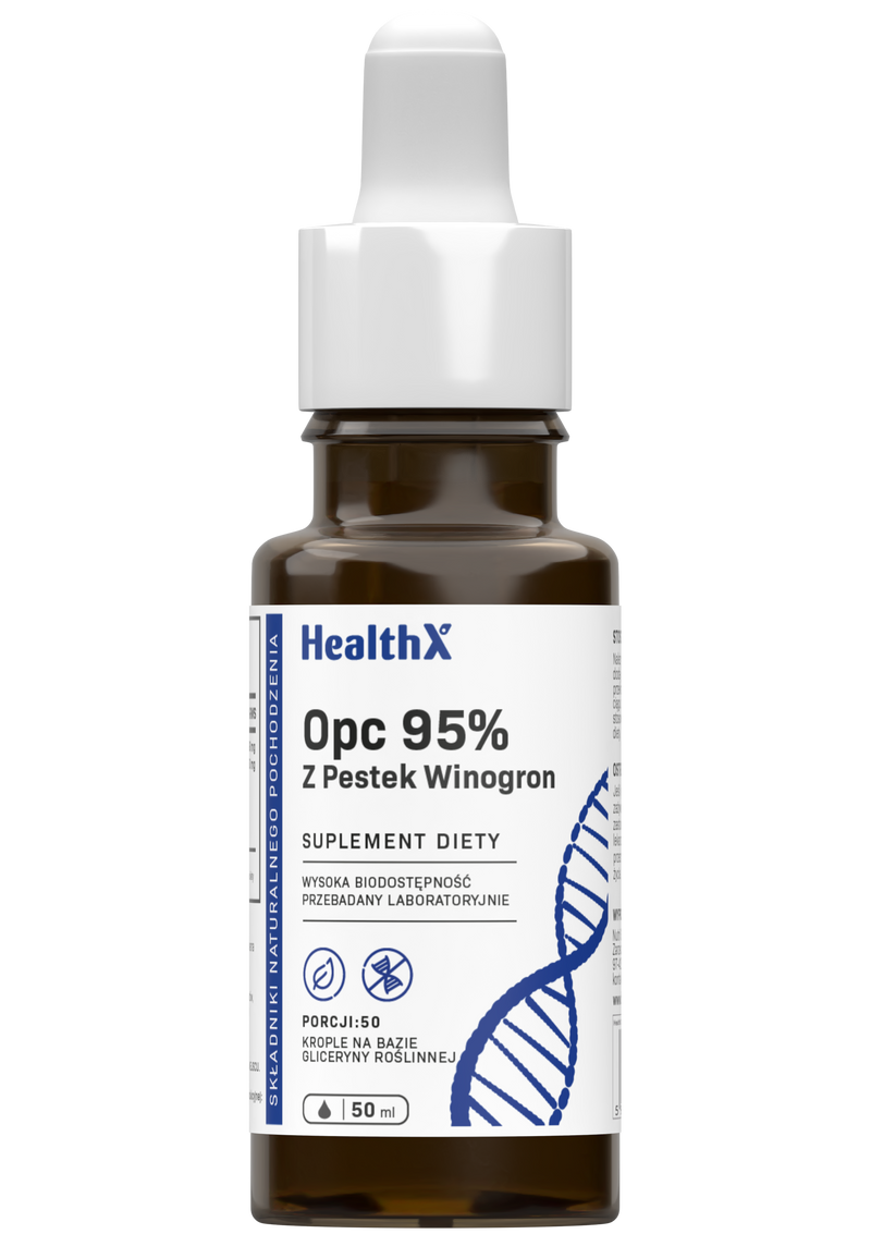 HealthX OPC 95% w kroplach to plynna forma ekstraktu z pestek winogron standaryzowanego na 95% oligomerycznych proantocyjanidyn (OPC) na bazie gliceryny roslinnej. Kazda porcja (1 ml) dostarcza 350 mg ekstraktu o najwyzszej standaryzacji -- szybkie wchlanianie i wygodne dawkowanie pipeta.
