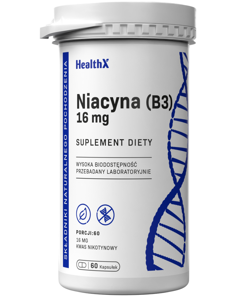 HealthX Niacyna w kapsułkach to kwas nikotynowy (witamina B3) — prekursor koenzymów NAD+ i NADP+, kluczowych dla produkcji energii i naprawy DNA. Każda kapsułka dostarcza 16 mg niacyny — 100% NRV w optymalnej dawce wspierającej metabolizm energetyczny i zdrowie skóry.