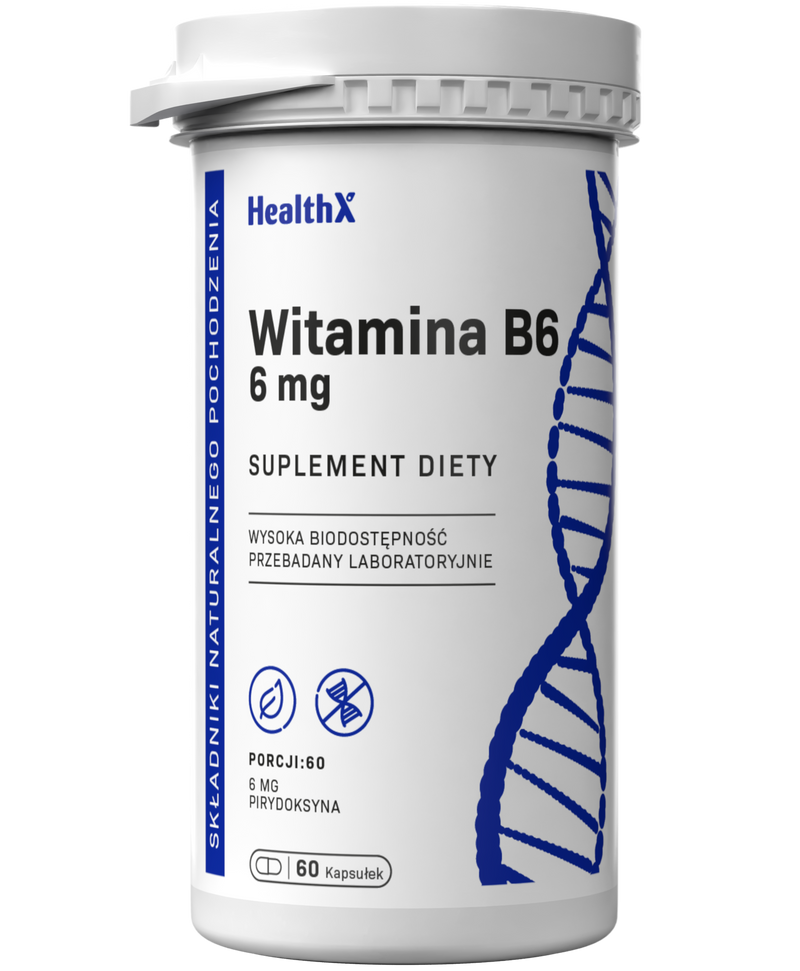 HealthX Witamina B6 w kapsułkach to pirydoksyna (witamina B6) — kluczowy koenzym metabolizmu aminokwasów i syntezy neuroprzekaźników. Każda kapsułka HPMC dostarcza 6 mg pirydoksyny — dawkę wspierającą układ nerwowy, metabolizm białek i prawidłową produkcję hemoglobiny.