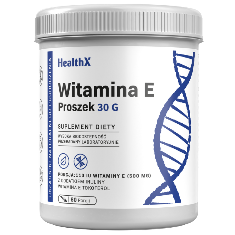 HealthX Witamina E Proszek to octan DL-alfa-tokoferolu (110 IU na porcje) na bazie inuliny z korzenia cykorii — czysta, elastyczna suplementacja antyoksydacyjna. Proszek idealny do shakeow proteinowych, koktajli owocowych lub napojow z tluszczem, ktory wspomaga wchlanianie witaminy E.