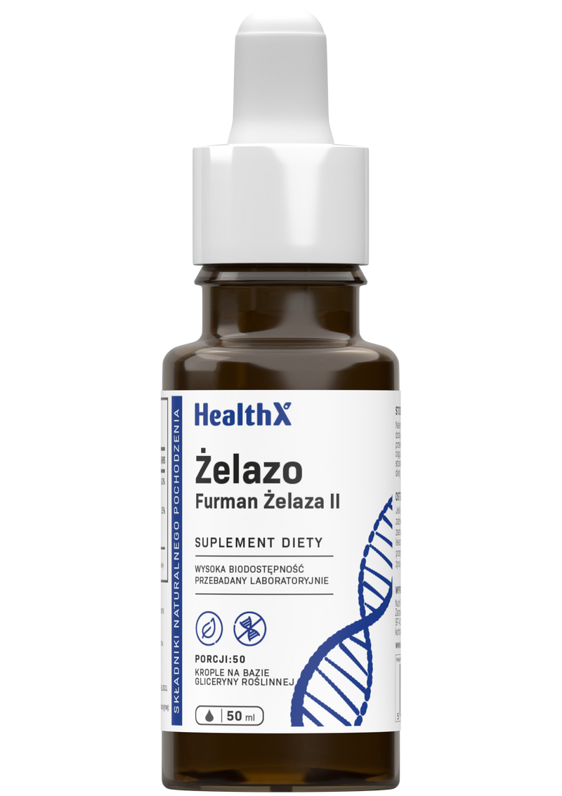 HealthX Zelazo w kroplach to fumaran zelaza(II) w postaci plynu na bazie gliceryny roslinnej z dodatkiem witaminy C — precyzyjna dawka 20 mg zelaza na 1 ml (ok. 20 kropli). Formula dwuskladnikowa: zelazo + witamina C w jednej buteleczce gwarantuje optymalna absorpcje bez koniecznosci kombinowania z osobnymi suplementami.