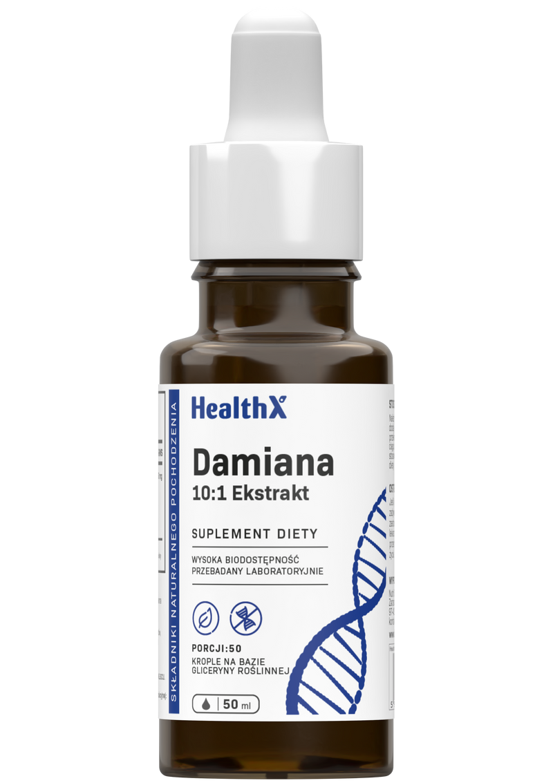 HealthX Ziele Damiana 10:1 Ekstrakt to skoncentrowany wyciąg z Turnera diffusa w formie kropel glicerynowych — 350 mg ekstraktu 10:1 na porcję oznacza ekwiwalent 3500 mg suszonego ziela. Damiana jest tradycyjnie stosowana jako adaptogen wspierający energię, witalność i libido oraz łagodzący skutki stresu i przemęczenia. Baza glicerynowa zapewnia łagodny smak i szybkie wchłanianie bez alkoholu.